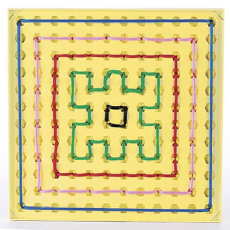 Вышивание происходит не обычным способом. Ребенок нажимает на иглу только на верхней стороне рабочей доски, а шнурок самостоятельно фиксируется в отверстии.