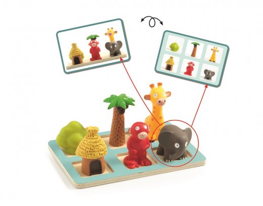 Настольная игра "Спасьо Эдульдо Djeco" предлагает детям не только познакомиться с различными животными, но и правильно расставить их по местам на специальной подставке. Поэтому набор можно использовать не только как развлечение, но и как тренажер для развития внимания ребенка.