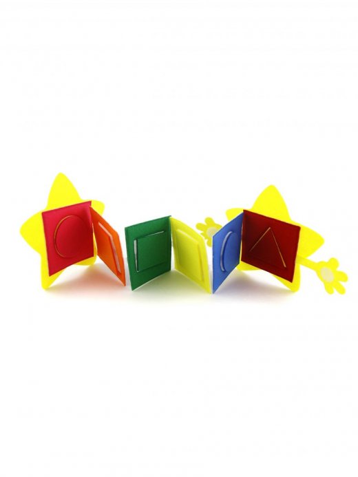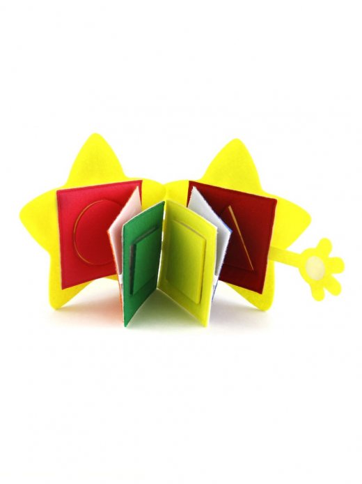 Книжка представляет собой 6 цветных рамок, соединённых между собой лентой и 6 соответствующих фигур. Обложка книжки выполнена в форме звездочки. В сложенном виде книжка закрывается на липучки.