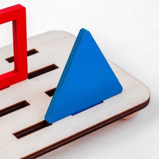 Задача ребенка выбрать из предложенных нужные фигуры по форме и цвету и разместить их на подставке, ориентируясь на карточку с заданием.