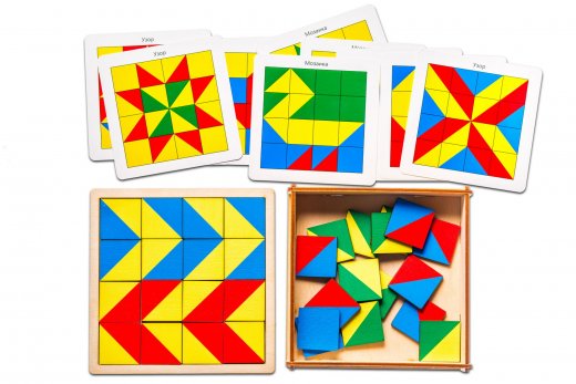 4. Игра «Заплатки». На игровом поле выложите рисунок по образцу на карточке, оставив несколько пустых мест. Предложите ребенку подобрать нужные «заплатки» в соответствии с образцом на карточке.
