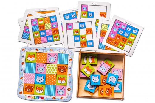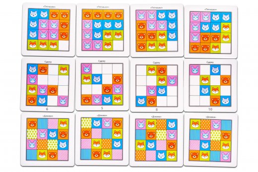 3. Игра «Судоку». Выберите одну из карточек «Судоку» и разложите фишки на игровом поле по образцу на карточке. Затем предложите ребенку заполнить все игровое поле фишками так, чтобы в каждом столбце и в каждой строке фишка с изображением одного и того же животного встречалась только один раз.