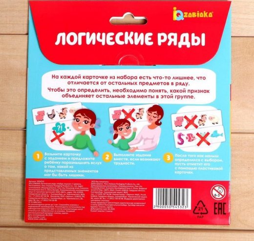 Развивающий набор «Логические ряды: найди лишнее. 3 уровень» создан для детей от 3 лет. В комплект входит 20 заданий и 5 пластиковых карточек.