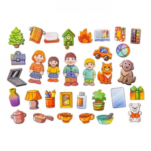 3. Игра «Наведи порядок». Открепите от коврика несколько фигурок с изображением посуды, предметов интерьера, мыла, комнатного растения и т.п. Попросите ребенка помочь навести порядок в доме, разместив все предметы в комнатах на соответствующих местах.