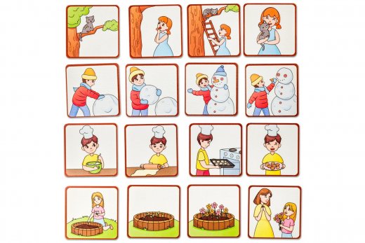 3. Игра "Составь рассказ". Предложите ребенку выбрать любые четыре картинки из одной серии и попросите внимательно рассмотреть их. Затем уточните, какие общие герои или объекты изображены на всех картинках, в каком месте и в какое время происходят события. Попросите описать действия героев. Уточните последовательность происходящих действий. Далее попросите ребенка разложить картинки по порядку в «окошки» и составить связный рассказ. Предложите придумать название получившемуся рассказу.