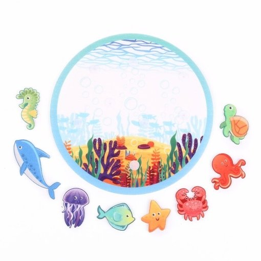 Игра «Подводный мир». Рассмотрите «Аквариум» вместе с ребенком. Спросите, кто живет под водой? Попросите найти и показать рыбку, краба, осьминога, морскую звезду, черепашку, морского конька, кита, медузу, водоросли. Игра «Морское путешествие». Расскажите ребенку, что вы «отправляетесь» в морское путешествие, чтобы получше познакомиться с подводными обитателями. Разложите все фигурки морских обитателей на игровом поле. Обсудите, где живут водные животные (в реках, озерах, морях, океанах). Расскажите ребенку, как дышат под водой морские животные, чем питаются. Игра «Морские прятки». Расскажите ребенку, что обитатели «Аквариума» любят тишину и поэтому прячутся от посторонних глаз. Выложите на игровом поле 4-5 фигурок морских животных. Попросите ребенка назвать и запомнить всех животных. После того, как ребенок закроет глаза, спрячьте одного обитателя. Открыв глаза, ребенок должен угадать, кто спрятался.