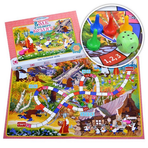 Настольная игра-ходилка Волк и семеро козлят имеет традиционную механику. Участники по очереди бросают кубик и передвигают свои фишки по игровому полю. Выигрывает тот, кто придет к финишу первым. Благодаря яркому дизайну, эта игра привлекательна в первую очередь для маленьких детей. Создана она по мотивам отечественного мультипликационного фильма. Большая часть игровых элементов выполнена из высококачественного картона — прочного и безопасного материала.