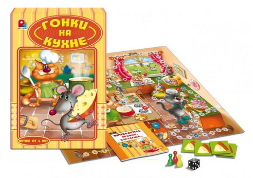 Настольная игра «Гонки на кухне» имеет очень интересное поле, изображение на котором представляется в объеме! Это кухня. На которой резвятся мышата и негодует злой презлой кот! Игра соединила в себе четны игры-ходилки (механика передвижения фишек основана на броске кубика), викторины (в игру включены вопросы на сообразительность) и элементы игр на общение (в игру включены разнообразные задания, которые нужно выполнить).