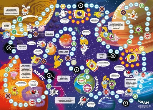 Игроки размещают свои фишки на красочно исполненном игровом поле и начинают игру! Чтобы определить очередность хода каждого игрока, все участники бросают кубик. Первым ходит тот, у кого выпало наибольшее количество очков. И так далее по убыванию. Игроки по очереди бросают кубик и передвигают свою фишку на выпавшее на нем количество ходов. Выигрывает участник, который первым окажется на финише.