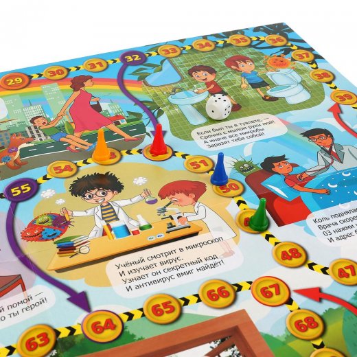 Ходилка Антивирус - это увлекательная игра, которая познакомит ребёнка с профилактическими мероприятиями, направленными на защиту организма от вирусов и вредных бактерий.
