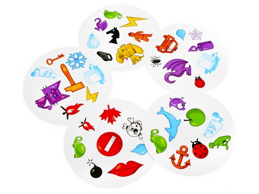 3) Правила. Сначала игроки переворачивают свои колоды лицевой стороной вверх. Игроки должны стараться быть быстрее всех при сбросе карточек из своей колоды в колоду в центре. Для сброса необходимо назвать изображение, совпадающее на верхней карточки их колоды и карточкой в центре. Игрокам нужно обладать хорошей реакцией , поскольку карточка в центре меняется сразу же, как на нее кладется карточка из колоды игрока.