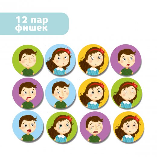 Мемо "Эмоции" состоит из 24 круглых карточек. На них изображены озорной мальчик и длинноволосая девочка. Дети на картинках выражают всевозможные эмоции. На одной иллюстрации девочка сердится, на другой грустит, на следующей она уже смеется. На лице мальчика также можно увидеть различные эмоции. Он ухмыляется, смеется, удивляется. В комплекте имеются по две совершенно одинаковые карточки. Именно такие пары нужно найти малышу.