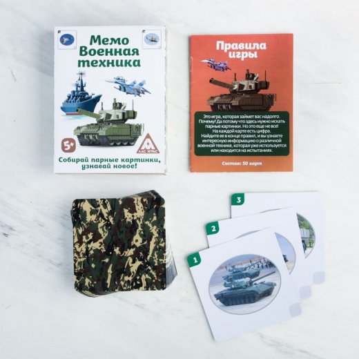 Настольная игра "Мемо. Военная техника" займёт вас надолго. В ней предстоит искать парные картинки и узнавать всё о новой военной технике.