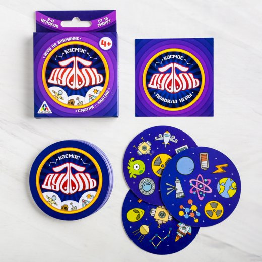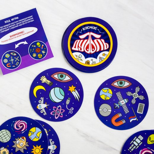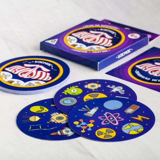 Настольная игра " Дуббль Космос " – простая и захватывающая игра на внимание, которая познакомит вас с планетами, звёздами, спутниками и всем тем, что находится в космосе! Внутри ждут карты с уникальными картинками, везде есть общие элементы. Ищите совпадения быстрее всех и побеждайте!