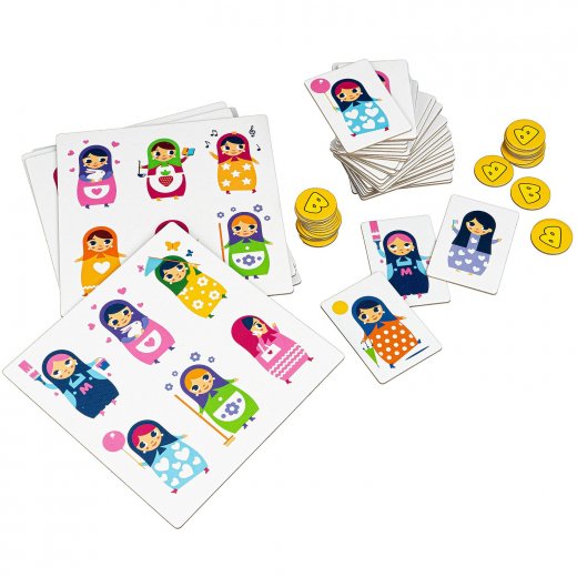 Игрокам необходимо среди всех игровых карточек найти именно те изображения матрешек, которые были изображены на его большой карточке. Матрешки похожи, и это не так просто сделать. Когда карточки выбраны, игрок переворачивает свою большую карточку и закрывает выбранными карточками соответствующие изображения.