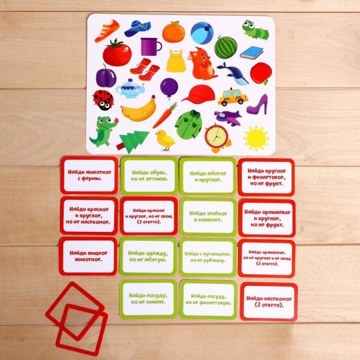 Разложите игровое поле и карточки. Прочитайте задание с карточки. Чтобы ответить на него ребёнку необходимо логически подумать и найти ответ на поле. Выбранную картинку отмечайте с помощью специальной пластиковой карточки. Проверьте выбор ребёнка и обсудите с ним, было ли решение правильным или нет и почему.