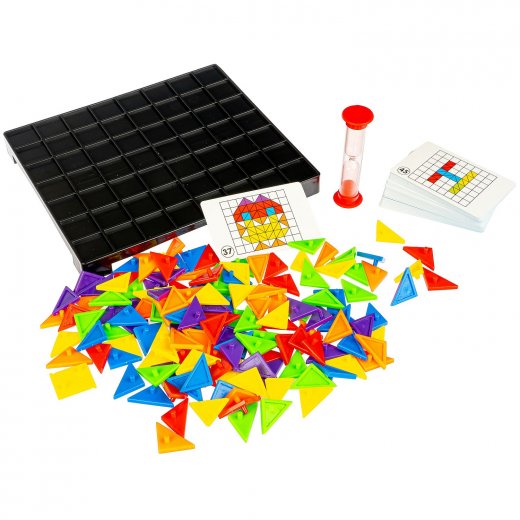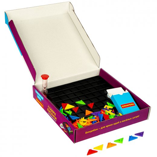 Состав игры: игровое поле, песочные часы, 54 карты-задания, 150 частей мозаики.