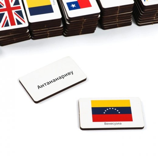 В наборе: 52 деревянные карточки с изображением флагов, названиями стран и их столицами в удобной коробочке.