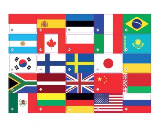 «Флаги» — это разновидность игр мемо. Их особенность в том, что успех зависит не от удачи, а от способностей и стараний игроков. Набор состоит из 50-ти карточек с парным изображением флагов.