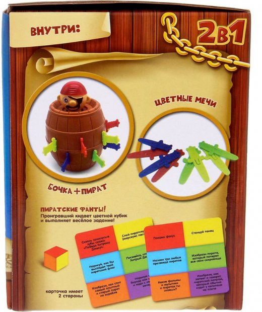 4. Игрок, после укола которого пират выпрыгнул, выбывает из игрового круга и кидает цветной кубик, выполняя после этого смешное задание пиратского фанта, соответствующего выпавшему цвету кубика.