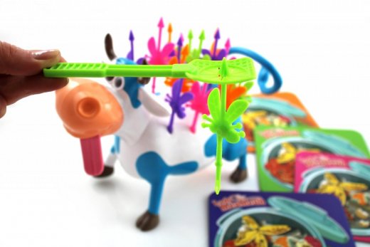 Каждый игрок выбирает хлопушку своего цвета и "мусорное ведро". Карточки "Ведер" надо положить в разные углы комнаты. В них вы будете относить пойманных мух. Включите корову, и она начнет двигаться. Теперь игрокам нужно поймать мух хлопушками. Как только поймали муху, бегите к мусорному ведру. И немедленно возвращайтесь обратно, чтобы выудить следующую добычу.