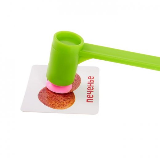 Разложите большие карточки на столе картинками вверх, возьмите по одному молоточку. На каждой из карточек есть картинка одной из 6 тем: одежда, игрушки, еда, фрукты, животные или мебель.