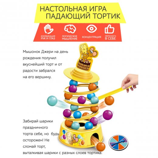 Быстрая и веселая игра - балансир "Падающий тортик". Цель игры: выталкивая шарики с основания один за другим, удержать фигурку мышонка на вершине тортика как можно дольше. Мышонок Джери наслаждается тортом на день рождения. Кремовый торт - его любимая еда. Кто вытолкнет больше шариков с кремом и не обрушит тортик, тот и победитель! Эта веселая игра требует стратегии и аккуратности при выполнении. 36 шариков балансируют между 4 обручами, формируя башню тортика. Не дайте тортику упасть! Занимательное развлечение способствует развитию ловкости, координации движений и логики. Игрушка идеально подходит для подарка. Товар предназначен для детей старше 3 лет и взрослых и рассчитан на 2- 4 игроков