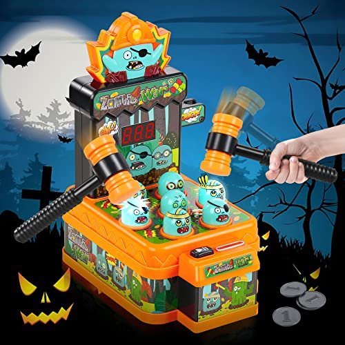 Развивающая игра «Война зомби», звуковые эффекты, работает от 3 АА батареек. У игрушки есть несколько режимов игры: можно просто проходить уровни игры попадая молоточком по загорающимся кнопкам; нужно попасть по загорающимся зомби (при этом лампочки очень быстро моргают) Игра на нескольких языках, руский язык можно выбрать нажав на зомби.Также можно выполнять задания нажимая на зомби пальцами. Вставьте монету чтобы начать игру. Результаты отображаются на дисплее. Развивает визуальные навыки, память,музыкальный слух, моторику ручек.