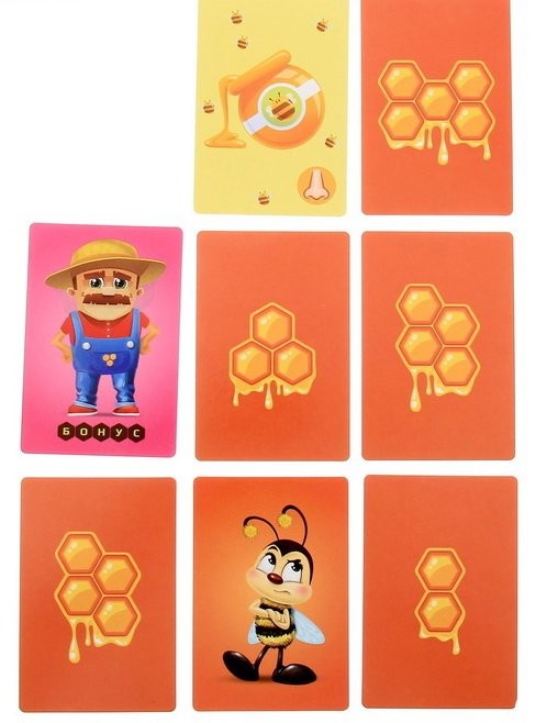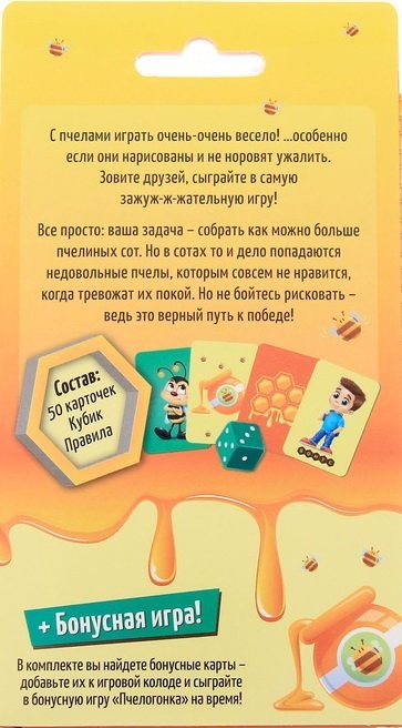 Выложите 6 карт в центр стола. Первый игрок бросает кубик, и забирает со стола карточку с тем количеством сот, число которых выпало на кубике. Сложность в том что вы не знаете, что принесет вам эта карта, будет это бонус или недовольная пчела. Игрок, собравший, трёх недовольных пчелок выбывает из игры, а остальные подсчитывают баллы. Игрок с наибольшим количеством балов побеждает и становится самым лучшим пчеловодом!