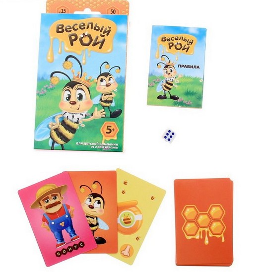 С пчелами играть очень, очень весело! Они ведь нарисованы и не норовят ужалить. Зовите друзей, сыграйте в самую зажжуж – ж – жательную игру!!! В Веселый рой можно играть как всей семьей, так и в компании друзей. Это отличная возможность весело провести время дома, на отдыхе, на детском празднике, на природе или на даче. В коробочке вас ждет подарок - бонусная игра Пчелогонки.