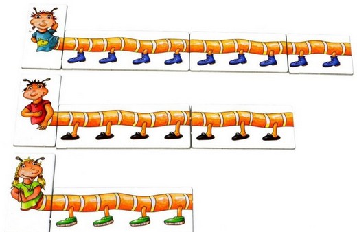 Состав: 15 жетонов ног в башмаках, 4 кубика, 4 жетона сороконожек.