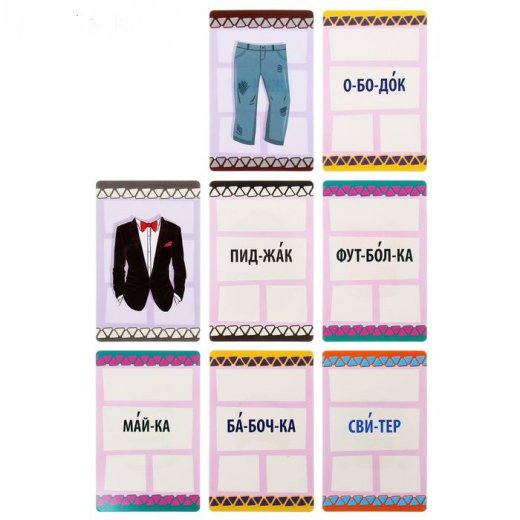 Нужно найти то, что связывает разные предметы и соединить их в пару. Слишком просто? Тогда специально для вас внутри есть еще семь увлекательных игр в ассоциации с «вещами из шкафа»! Разыграть их вам помогут универсальные карточки из набора! На них есть и яркие картинки, которые можно группировать самыми разными способами, и слова, написанные по слогам, чтобы ваш кроха с легкостью прочитал их нараспев.