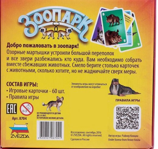 Настольная игра "Зоопарк" от торговой марки "Звезда" представляет собой развлекательную логическую игру, в которой игрокам предстоит собрать свой собственный зоопарк и таким образом набрать как можно больше очков.