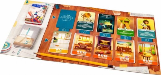 Карты помощников: кладите их лицевой стороной вверх рядом с планшетом дома. Помощников вы используете в конце игры при подсчёте очков — кроме дизайнера интерьеров, который поможет вам во время игры.