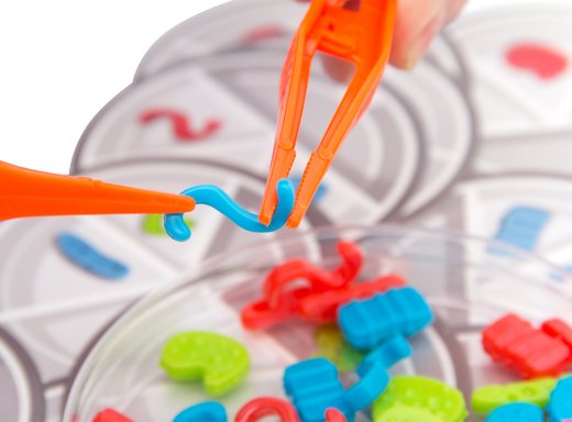 С помощью пинцетов игроки перетаскивают микробов по одному из большой чашки Петри в центре стола в свои чашки Петри.