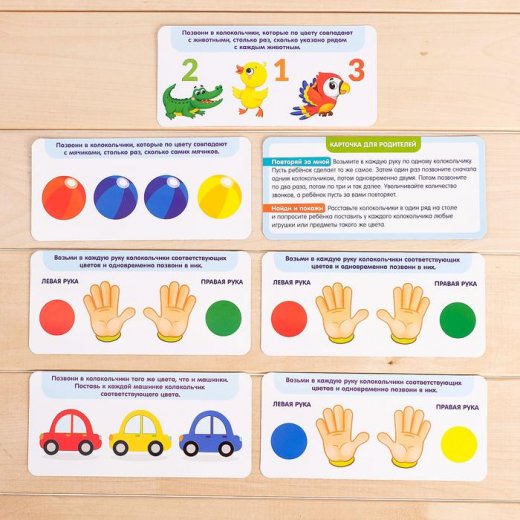 Внутри коробки вы найдете 4 колокольчика, которые пригодятся для изучения цветов, счета и выполнения других интересных заданий.