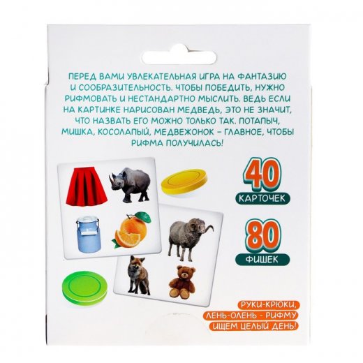 Водящий достаёт карту и участники придумывают рифмы к словам, изображённым на ней. Первый игрок выкрикивает свою рифму и выкладывает её из своих жетонов. Рифм может быть несколько!