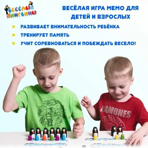 "Веселые пингвины " – это игра для самых маленьких любителей настольных игр. Малыши от 3-х лет с удовольствием перемешивают и вскрывают этих гордых птичек. Игра развивает мелкую моторику рук и зрительную память. Все элементы очень яркие, красивые и качественные! Игра отлично подойдет на подарок любому малышу или в семью с детками.