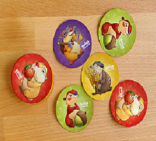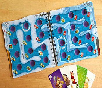 Состав: 58 карт, перелистываемое шестистраничное поле с отверстиями, 5 деревянных игровых фишек, 5 жетонов-"корзин", игральный кубик, правила игры.
