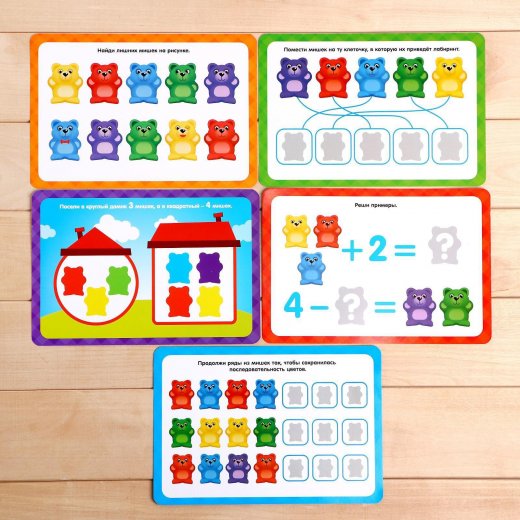 Состав игры: 25 разноцветных мишек, 10 карточек с заданиями.