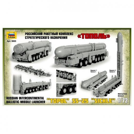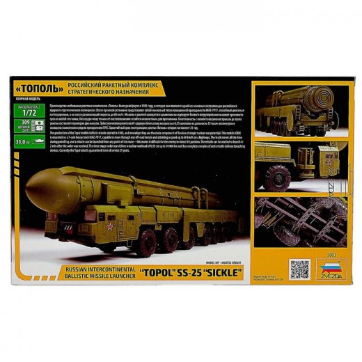 РТ-2ПМ «Тополь» — передвижной комплекс с межконтинентальной баллистической ракетой. После длительной разработки был принят на вооружение в 1988 году и до сих пор находится в эксплуатации. Установка способна производить пуск трёхступенчатой ракеты как с открытой местности, так и из укрытия с раздвижной крышей на расстояние до 11 000 км. Сборная модель «РРК Тополь» — это точная копия ракетного комплекса в масштабе 1:72. Склейте все элементы, и у вас на полке окажется уникальная современная техника.