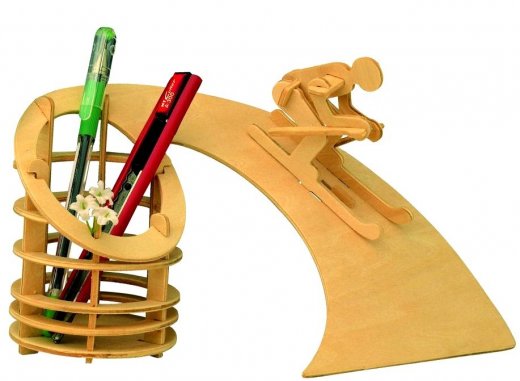 С этим набором можно собрать подставку оригинальную подставку для ручек с фигуркой лыжника, спускающегося с горки. Собирать модель будет интересно как мальчикам, так и девочкам любого возраста. Все детали сделаны из экологически чистого дерева и их нужно не вырезать, а просто выдавить из пластины. Никакие специальные инструменты не потребуются, так как детали в пазах будут держаться крепко, но по желанию можно укрепить поделку клеем ПВА. Детали скрепляются в порядке и очередности, обозначенной в инструкции. Подставка для ручек будет прекрасно смотреться в любом интерьере - ведь сделана она руками Вашего ребенка.