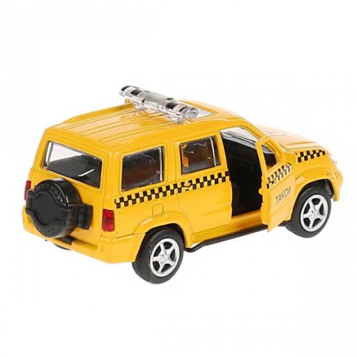 Игрушка выполнена точной масштабной копией автомобиля Уаз Патриот – Такси. Модель машинки выполнена из металла с добавлением некоторых элементов из качественного пластика. Масштаб исполнения копии 1/50. Игрушка выполнена с высоким уровнем детализации. Кузов автомобиля имеет жёлтый цвет и украшен надписью «Такси» и чёрными шашечками. На кузове установлены сигнальные маячки. Автомобиль имеет функциональные открывающиеся передние двери, что добавляет ей реалистичности. Сквозь прозрачные стёкла можно рассмотреть подробно исполненный салон авто. Колёса автомобиля с резиновыми шинами, крутящиеся, благодаря чему игрушку можно катать по поверхности. Автомобиль снабжён инерционным механизмом, благодаря чему способен проехать большое расстояние после лёгкого толчка вперед. Машинка от торговой марки «Технопарк» понравится коллекционерам миниатюрных моделей техники. Мальчишки с удовольствием поиграют с моделью машины, совершенствуя мелкую моторику рук и развивая фантазию и воображение. Игрушка выполнена из качественного и прочного пластика и металла.