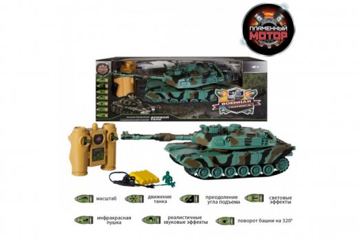 Р/у модель танка Abrams M1A2 с реалистичными светозвуковыми эффектами при стрельбе и визуальными эффектами (отдача при выстреле). Танк осуществляет движение вперёд/назад, повороты вправо/влево, подъёмы под углом 45°, круговое вращение на месте и поворот башни вправо/влево на 320°. В игрушке предусмотрены демонстрационный режим и автоотключение. Танк оснащён функцией боя. При покупке 2-х и более танков ТМ "Пламенный мотор" и "CROSSBOT" вы получаете возможность командной игры в танковый бой до 10-ти игроков одновременно.