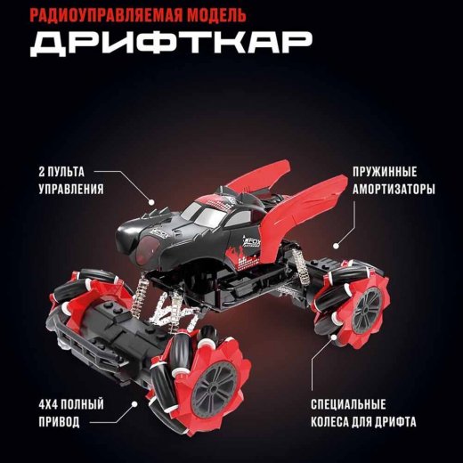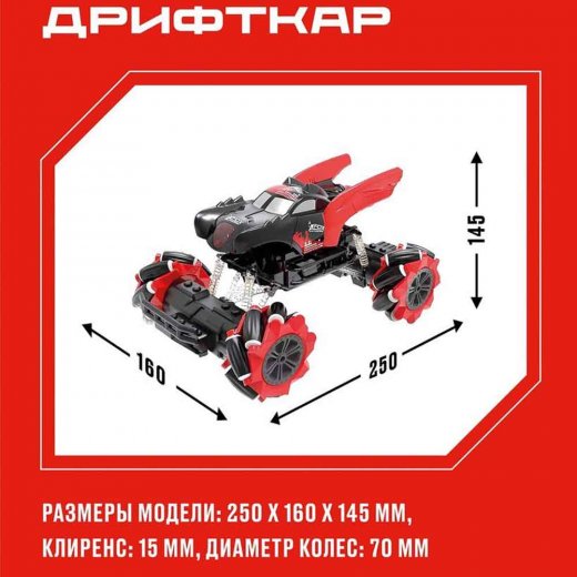 Радиоуправляемаямодель Дрифткар 2 в 1: с возможностью управления пультом и сенсорнымбраслетом. Игрушка осуществляет движение вперед и назад, повороты направо иналево, трюковое движение боком вправо, влево и по диагонали, а также вращениена 360 градусов против/по часовой стрелке.