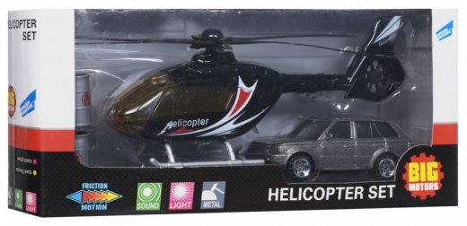 Игровой набор Вертолет и машина – отличное приобретение для увлекательной игры Вашего малыша и его лучшего друга. В набор входит вертолет со световыми и звуковыми эффектами и вращающимися лопастями винта, автомобиль и две бочки. При нажатии на пропеллер вертолета, у него включаются световые и звуковые эффекты. Каждый из видов транспорта этой серии отличается высокой степенью детализации и будет долгое время радовать своего обладателя. Маленький затейник несомненно придумает множество интересных игровых сюжетов с набором. Теперь устроить головокружительные трюки с участием вертолета и машины проще простого!