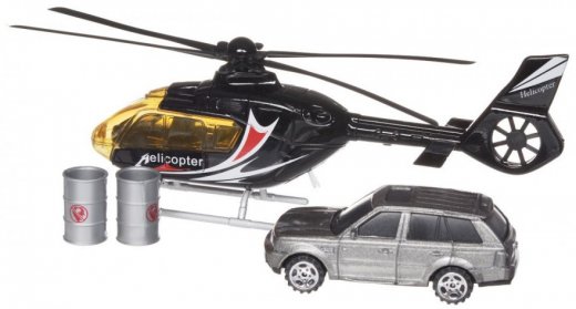 Состав набора: вертолет, машина, 2 бочки.