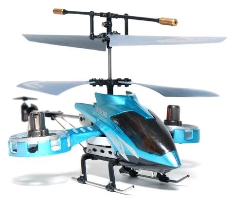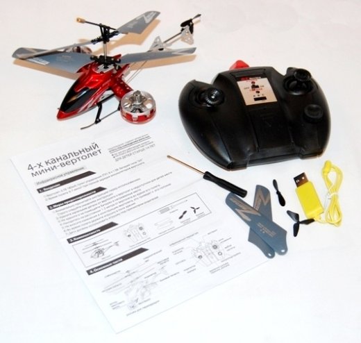 Дистанционно управляемый вертолет - это новинка на российском рынке, в отличие от своих собратьев, имеет целых пять роторов, два из них основные, вращающиеся в противоположнее стороны, один задний и два оставшихся боковые. Как вы уже поняли, при помощи боковых винтов, вертолет осуществляет боковые маневры, а благодаря заднему ротору может передвигаться вперед и назад. Управление вертолетом осуществляется при помощи четырех канальной системы с инфракрасным передатчиком дистанционного управления. Радиус действия такого передатчика не превышает 10 метров.