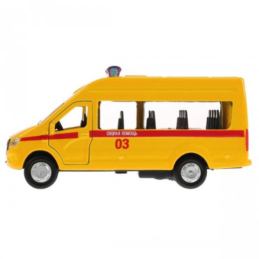 Машина выполнена с учётом всех особенностей прототипа. Реалистичный яркий дизайн c надписями - "Скорая помощь", "03" и мигалками, позволит с головой погрузиться в игру и ощутить себя настоящим спасателем. Благодаря открывающимся дверям, которые делают машинку максимально похожей на настоящую, всегда можно заглянуть машинке внутрь, чтобы убедиться - каждая её деталь отлично проработана. Колесная база оснащена инерционным механизмом, что позволяет придавать ей ускорение, слегка потянув машинку назад, а затем отпустив.
