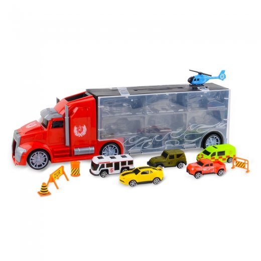 Набор машинок Handers "Трейлер: городские автомобили" - это большой трейлер, который везёт 5 машинок, вертолёт и дорожные знаки к месту назначения.